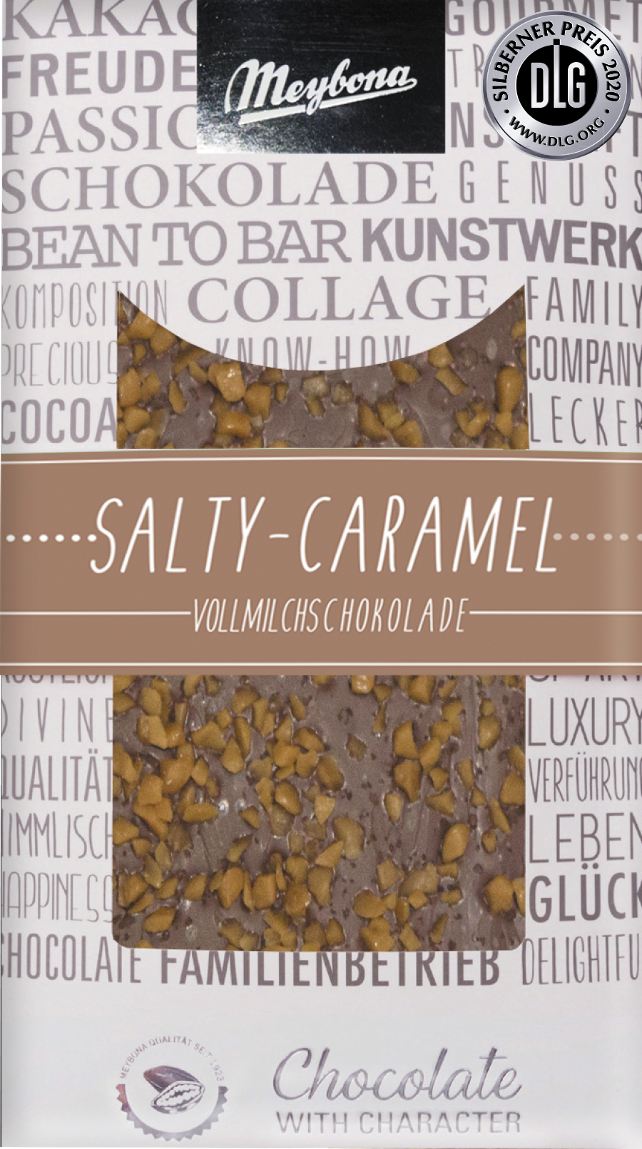 Milk chocolate decorated with crunchy caramel pieces and rock salt from Pakistan.