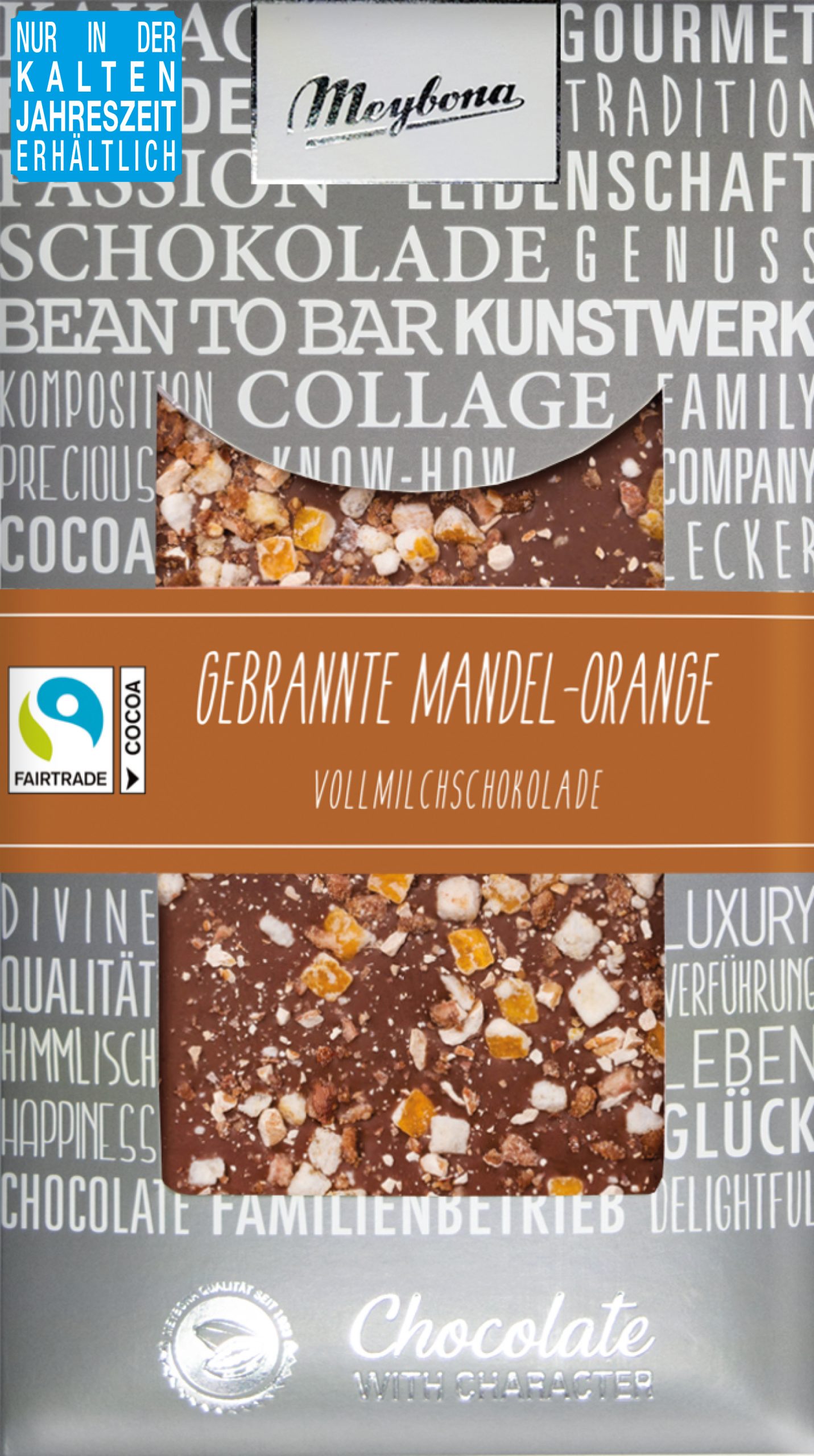 Vollmilchschokolade bestreut mit Orangeat, gebrannten Mandeln und Lebkuchengewürz.